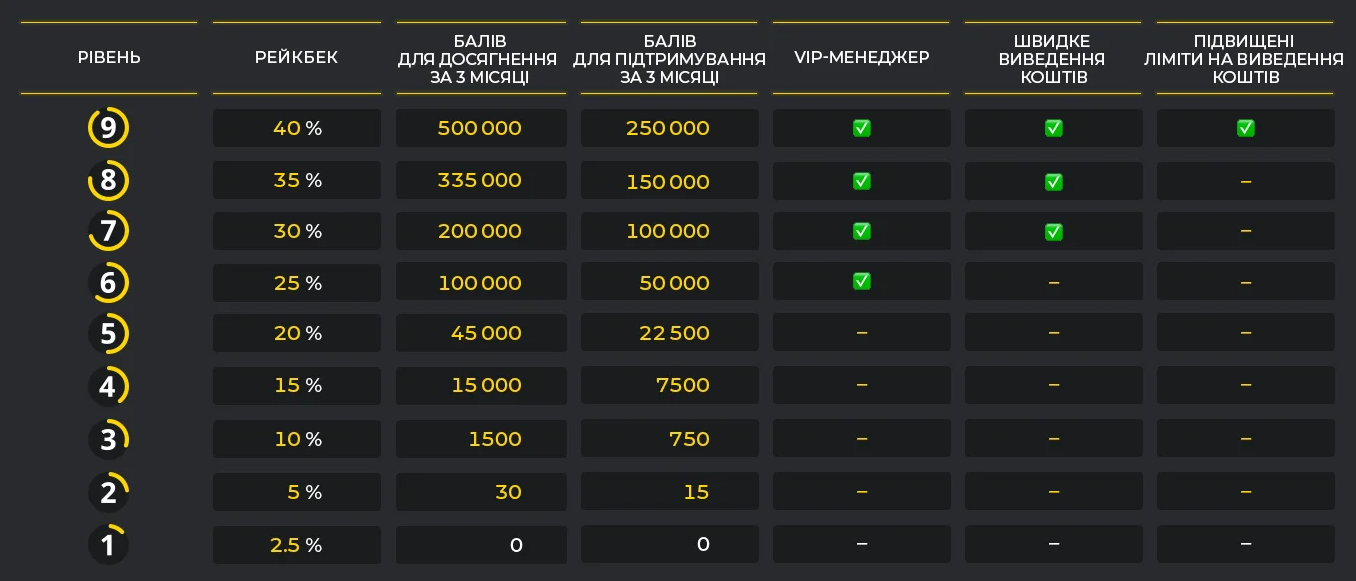 Рейкбек у балах: Повернення комісії відбувається в балах, і їхня кількість залежить від вашого рівня.